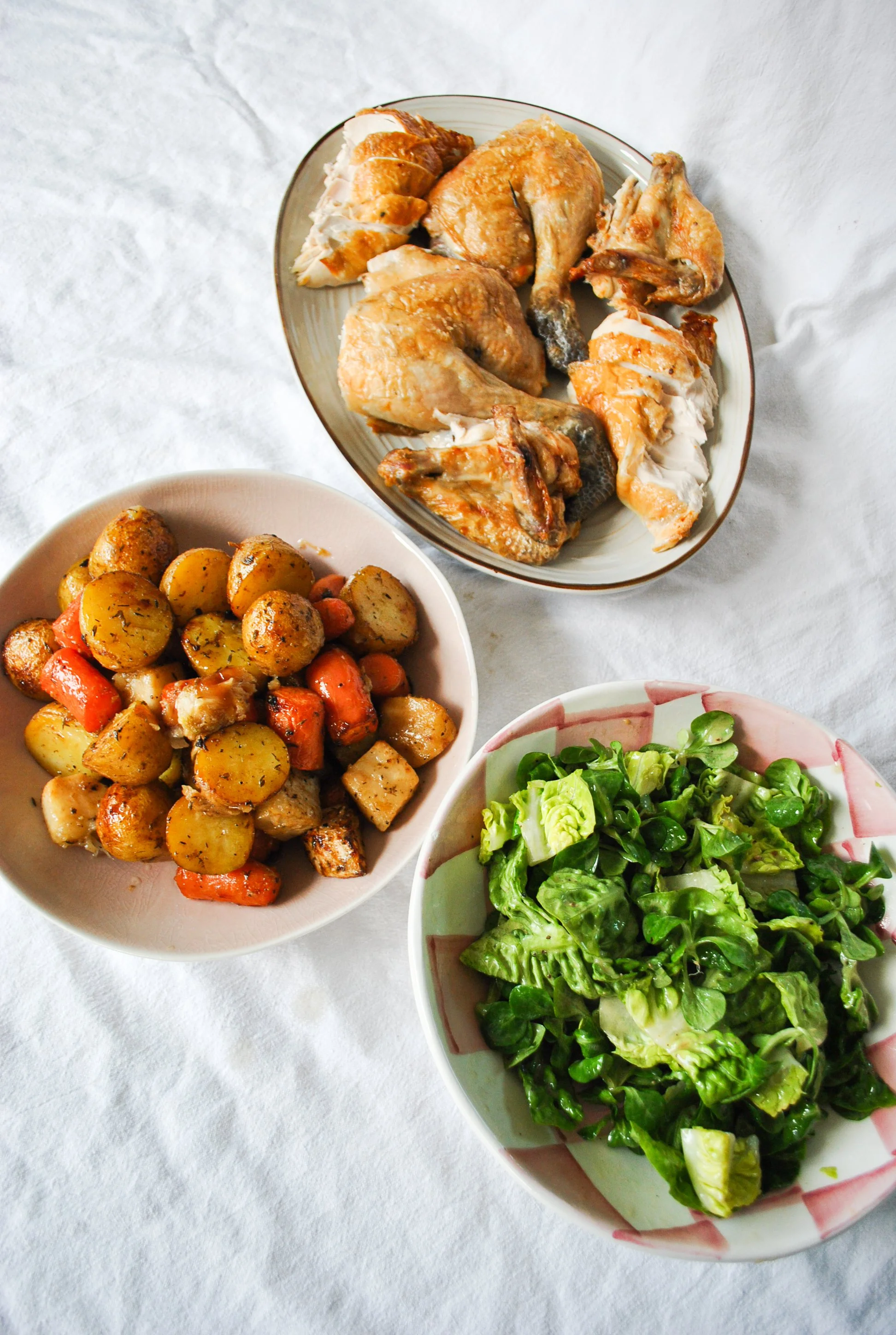 While the chicken is resting, return the vegetables to the oven for 10-15 minutes, this time placing them higher in the oven to help them colour.