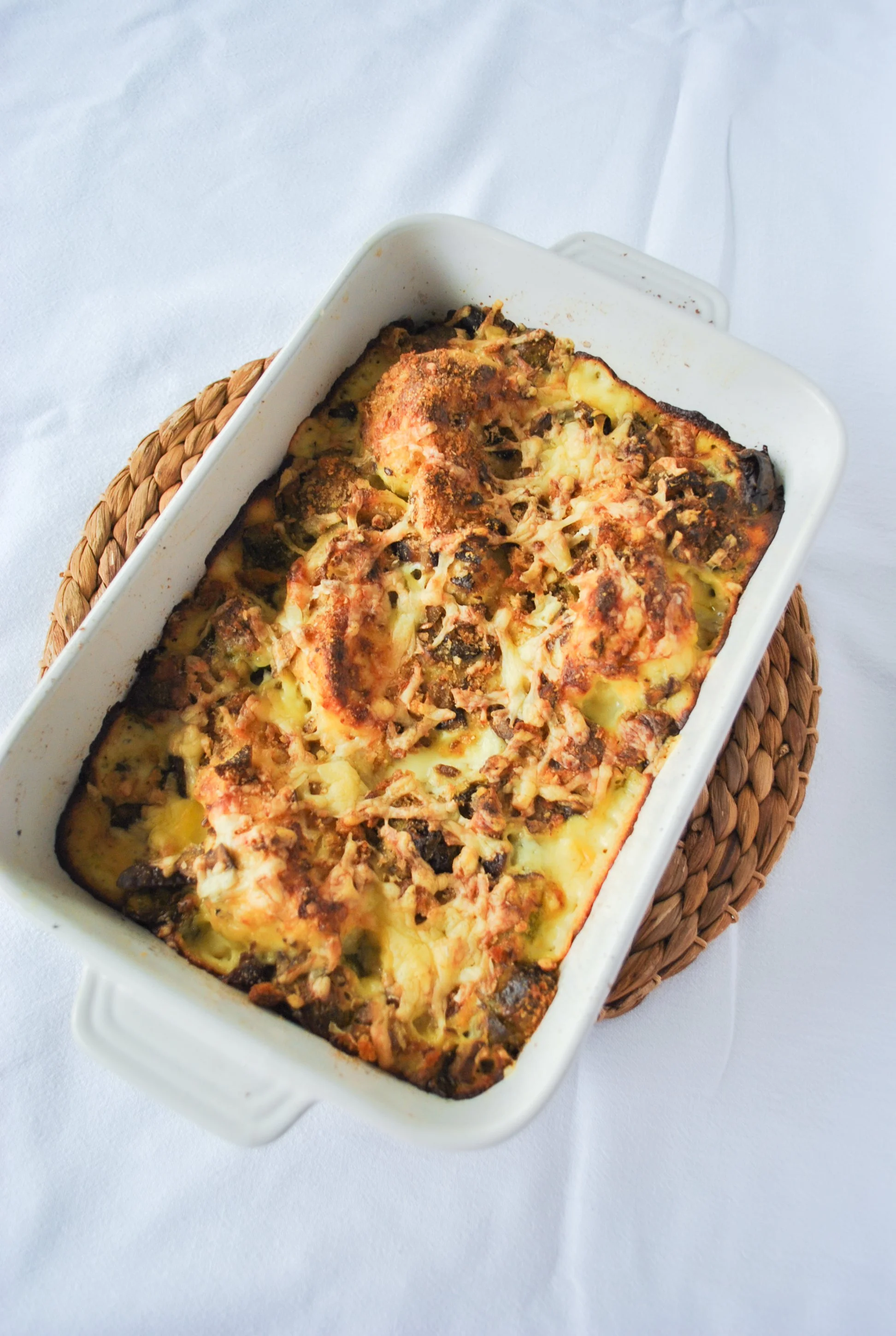 Pour the cheese sauce evenly over the top of the roasted veg. I prefer to use a slightly smaller baking dish for this part so it stays saucier.