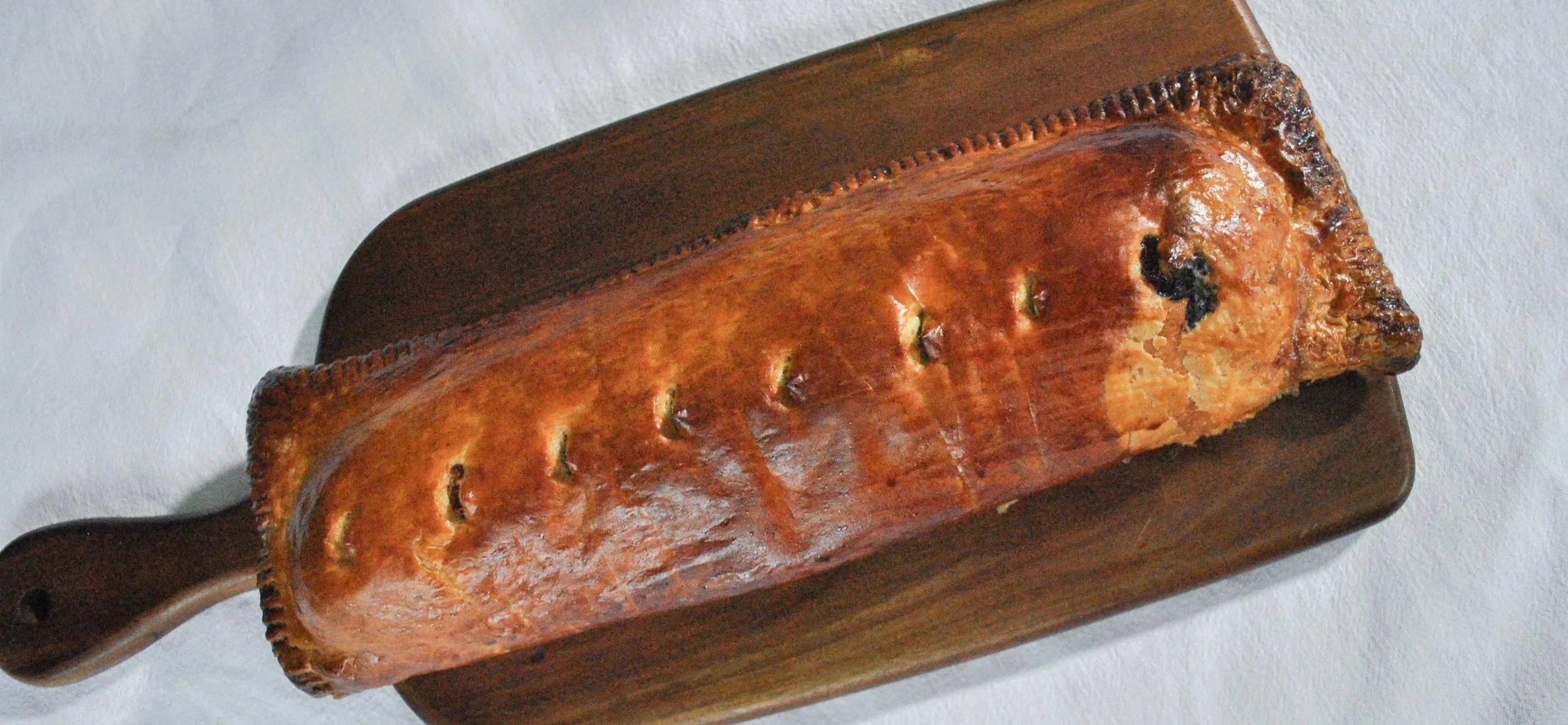 This is a fully loaded, celebratory sausage roll with layers of smoky bacon, nutty cheese, sweet-sharp cranberry and mustard, wrapped in crisp puff pastry. It’s unapologetically rich, deeply savoury and designed for slicing thick and sharing while still warm.