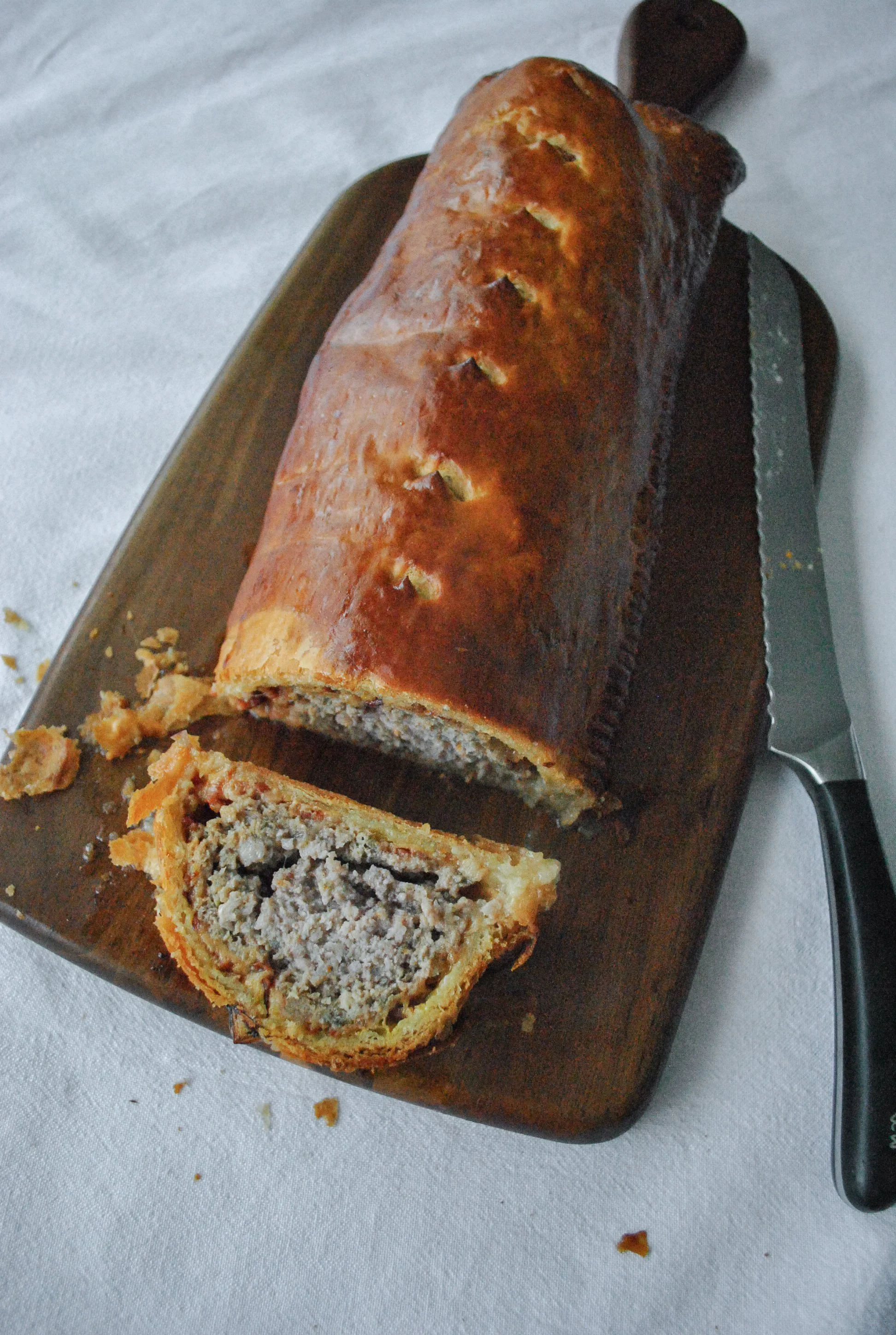 Bring the pastry up and over the filling, pressing the edges together. Roll on it’s side so the seam sits to one side, flatten the excess pastry and crimp firmly with a fork.