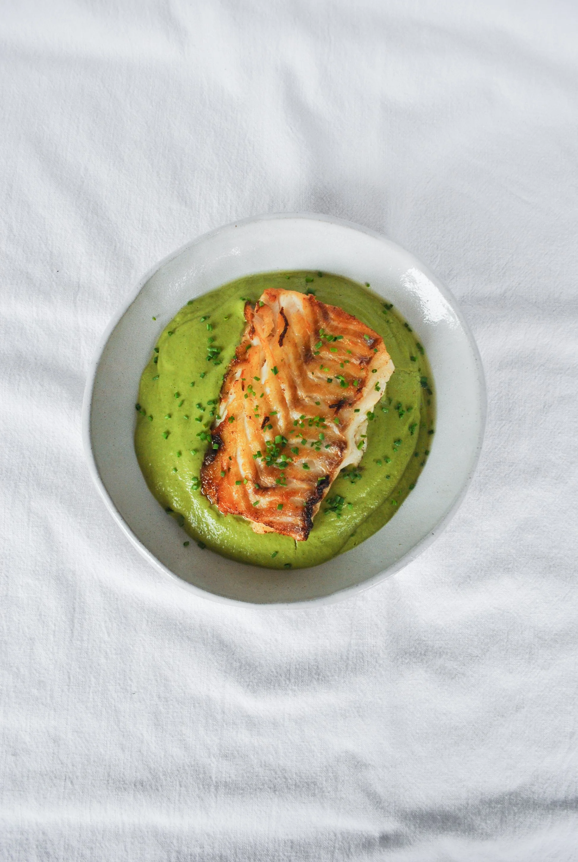 The vegetables are sautéed until soft and sweet, then blended with ricotta into a smooth green sauce that feels rich whilst still fresh and balanced. The cod is pan-fried until golden, but still soft and flaky inside, and it’s served over beluga lentils, which are nutrient-dense and add a lovely contrast in texture.