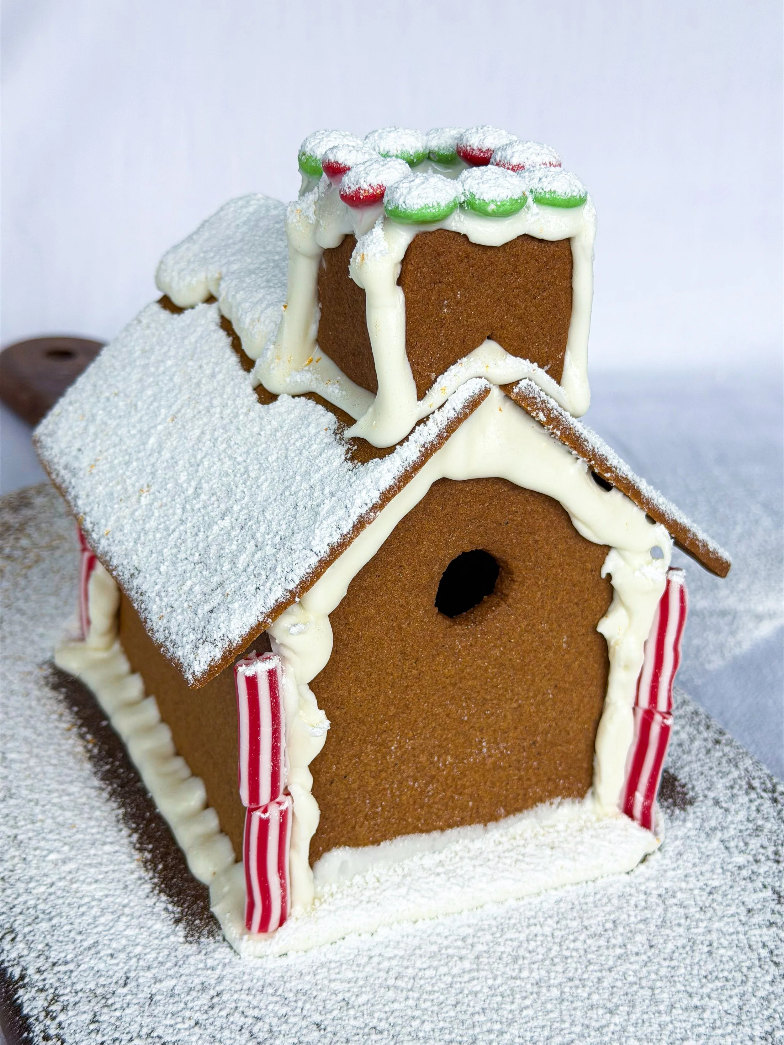 To build the house, lay the front, back and sides roughly in position on a board. Attach one wall to the board first, then, one at a time, pipe icing along the edges and join the others. Little ones will likely need help here — even adults usually do. Be generous with the icing; it can always be covered up later, or made to look like snow!