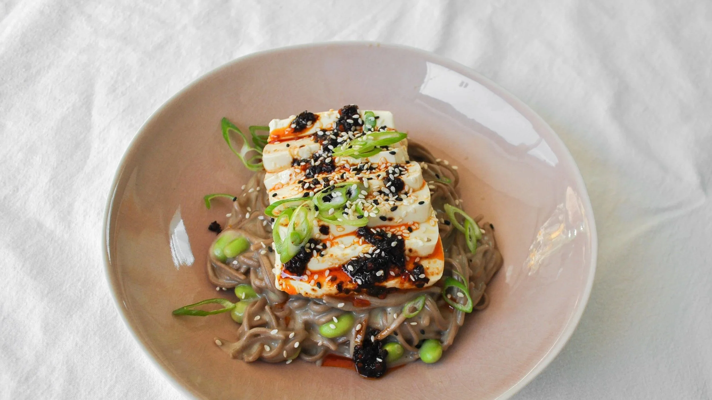 While the noodles cook, carefully drain any liquid from the tofu and side it onto a plate. Slice into it and drizzle with sesame oil and chilli oil.